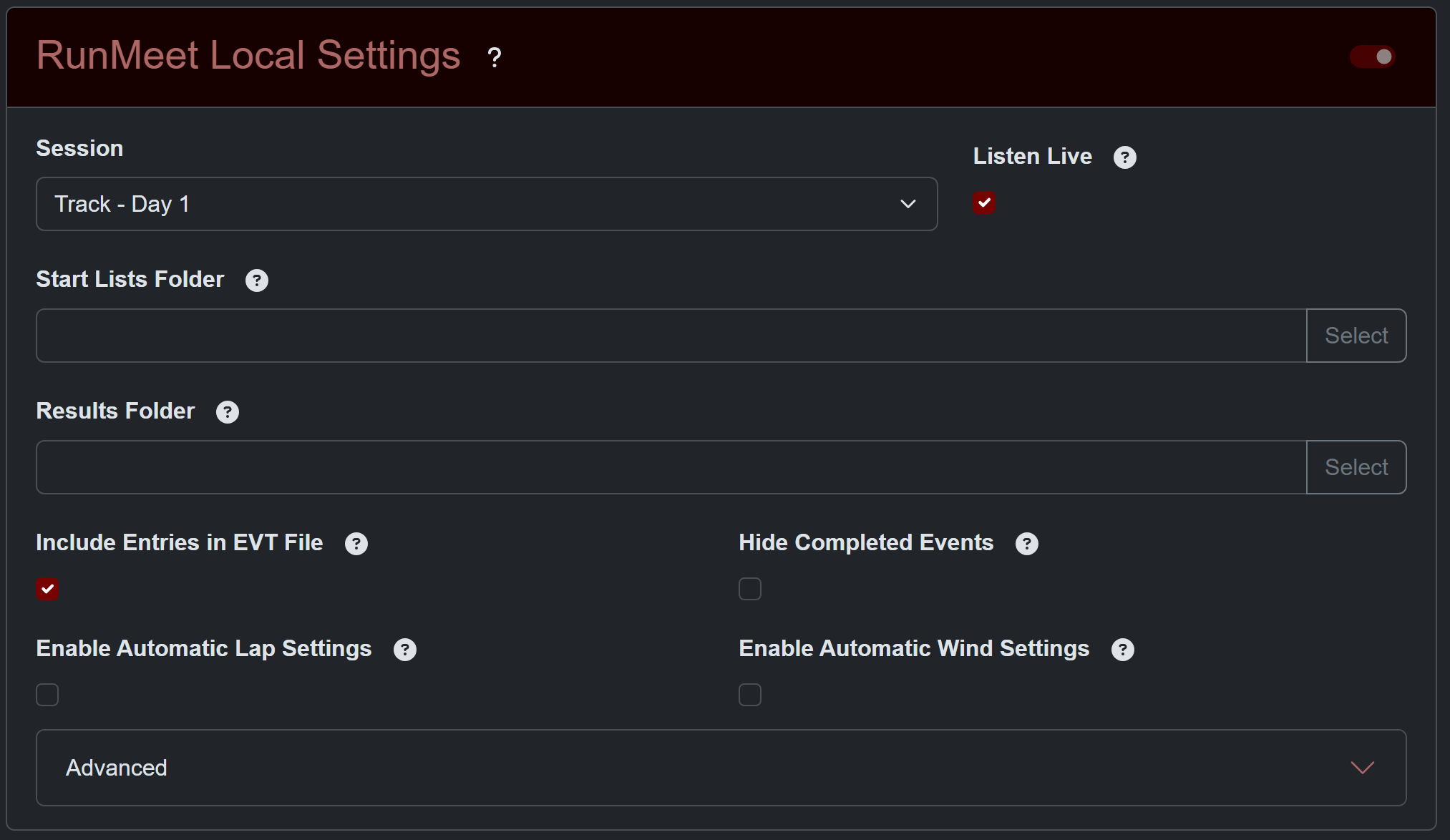 Once you've selected your meet, you should see "RunMeet Local Settings" below. You'll need to tell AthleticLOCAL where to save start lists to and read results from on your computer. Click the Select button next to Start Lists Folder and select the folder where AthleticLOCAL will save start lists. Then, click the Select button next to Results Folder and select the folder where your FAT software will save results (LIF) files.