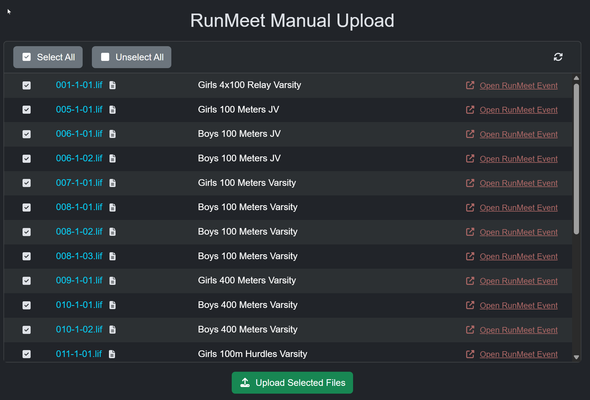 If you did not check "Listen Live", click RunMeet Manual Upload in the sidebar. You'll see a list of results (LIF) files located in the Results Folder you chose on the Setup screen.