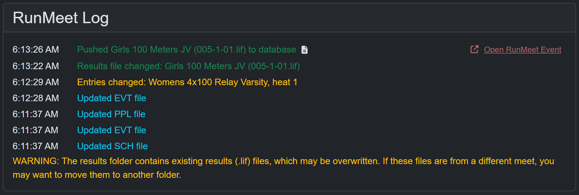 If you checked Listen Live, the Dashboard will show a RunMeet Log log of all actions completed by AthleticLOCAL.
