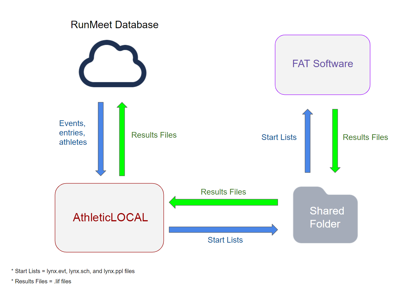 AthleticLOCAL is a Windows app which acts as the interface between AthleticRUNMEET and your FAT software. It creates start lists and rosters for your FAT software to read, and uploads results (LIF) files saved by your FAT software to the RunMeet database.