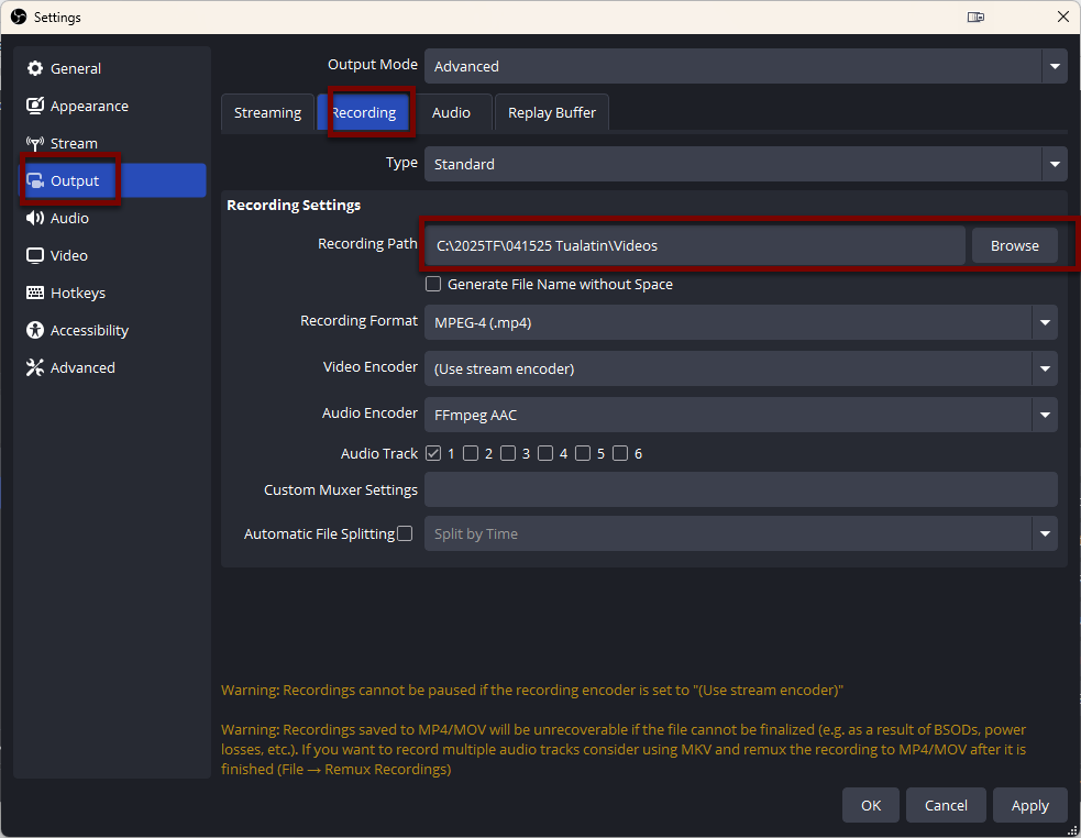 - Set your File Save Directory: In Settings, Output, and Recording. This will be where your video files are saved with the use of the Start Recording and Stop Recording buttons.