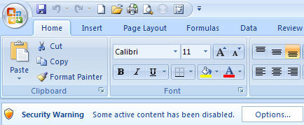 Upon opening the EMMxc you should see the following bar at the top of your screen. Click "Options" and then click "Enable this content" and then "OK."
