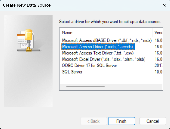 Select Microsoft Access Driver (*.mdb, *accdb), then click Finish.