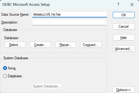 Set the Data Source Name to AthleticLIVE HyTek, then click OK. No other options need to be configured on this screen.