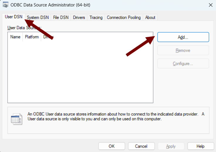 From the User DSN tab, click Add.