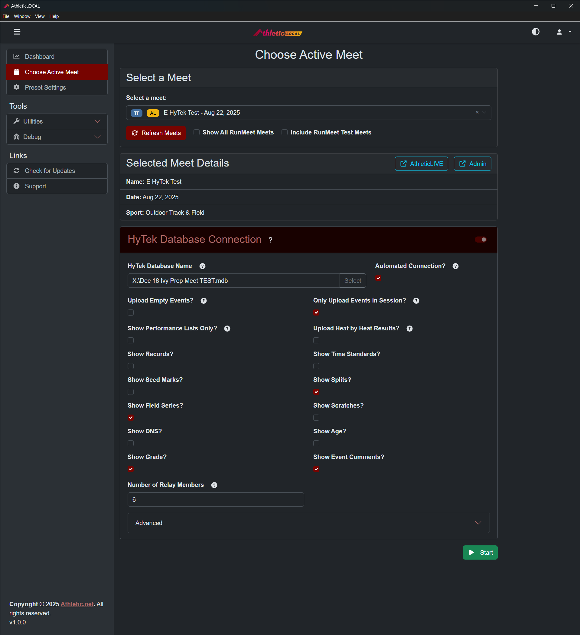 Run AthleticLOCAL, and select the meet you created. For more information, see Install and Operate AthleticLOCAL. Once you select a meet that is configured to use a HyTek Database Connection, you will be prompted to configure the settings necessary.