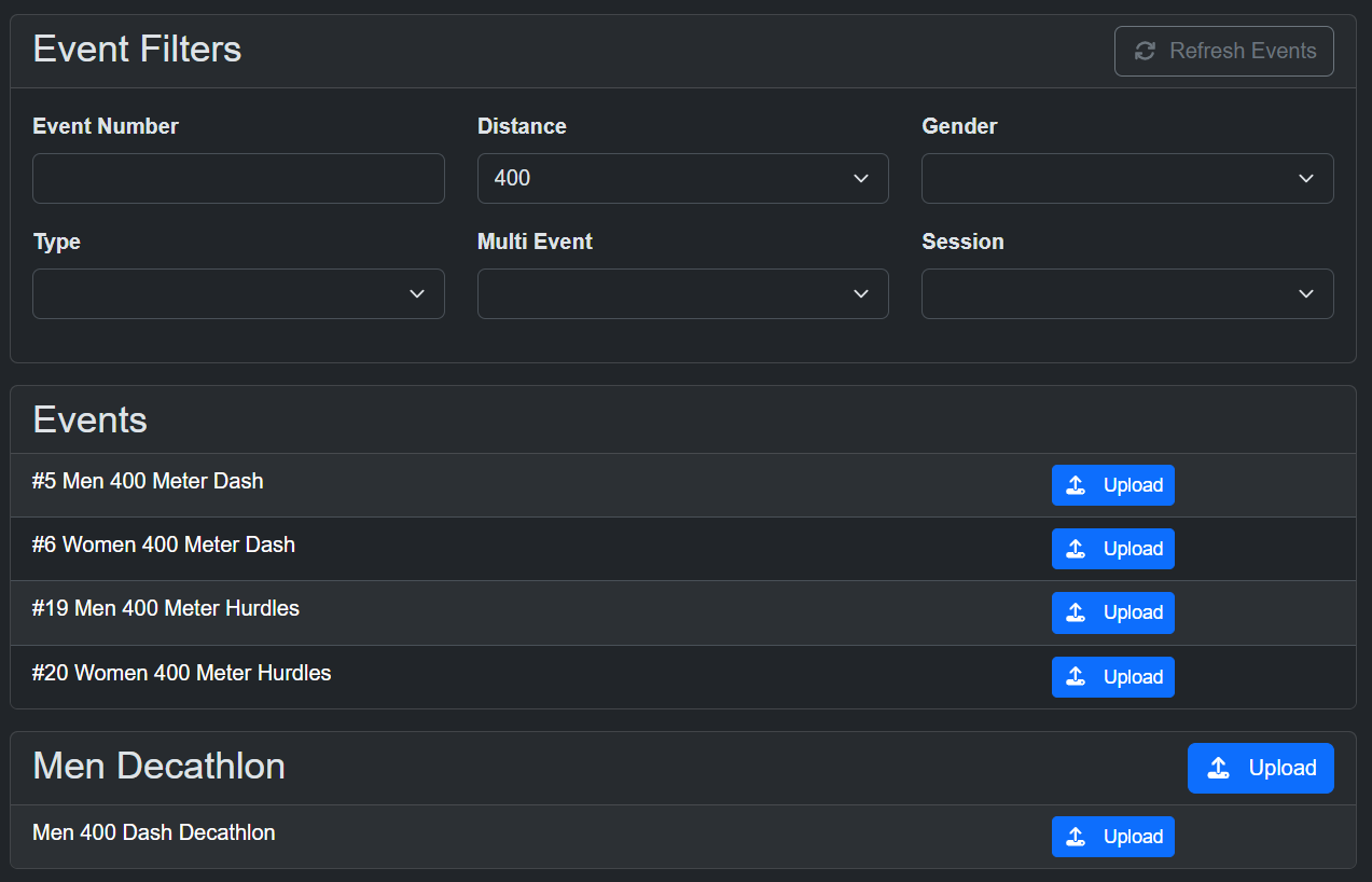 Once you've uploaded all or part of the meet structure, you can then upload events one by one. Events will all be displayed in the Event List on this page, and you can click Upload to upload all data currently available for the event (heat sheets, performance lists, results). Available data for all rounds will be uploaded.
