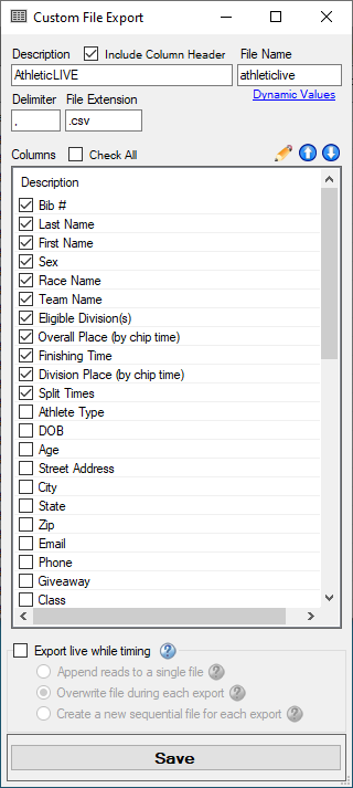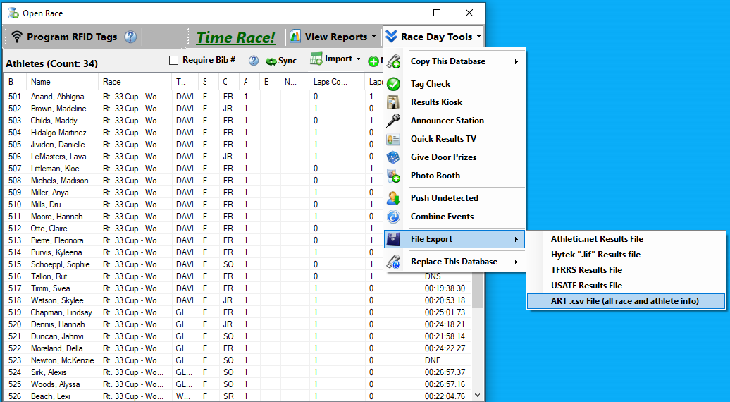 - Click "Race Day Export" -> File Export -> ART .csv File (full race and athlete info)