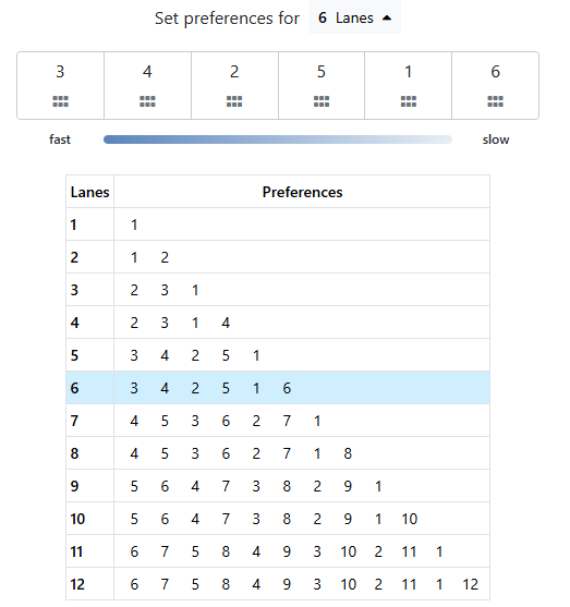 To configure lane or alley preferences, select the number of lanes/alleys you like to set preferences for by using the "Set preferences for" dropdown or clicking a row in the table. Then, drag each lane/alley block into the order you would like the lanes/alleys to be assigned.
