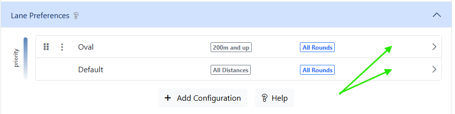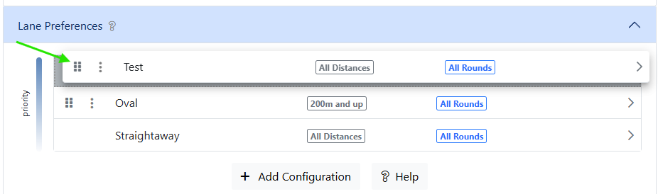 When a laned event is seeded, the configurations are evaluated in priority order. The first configuration matching an event’s distance and round is applied. If no higher-priority configurations match an event's distance and round, the default configuration will be used.