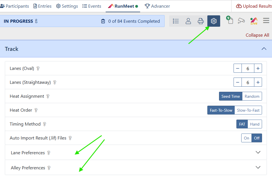 Lane and alley preferences determine the order in which lanes and alleys are assigned to an ordered list of entries (usually ranked by seed time). Lane/Alley Preferences can be configured during the initial AthleticRUNMEET setup, or any time by clicking the settings (gearwheel) icon in the nav bar.