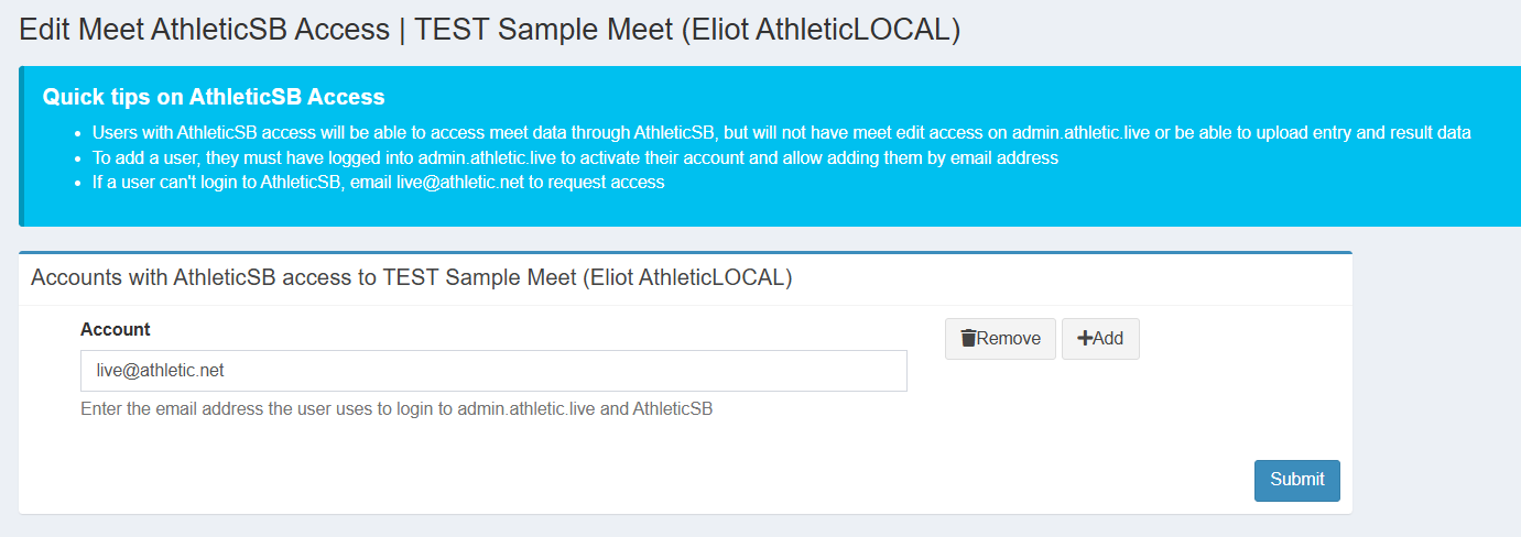 If someone outside of your account or AthleticLIVE organization needs access to just scoreboard data for a meet, share the meet with their account instead of giving them your login. Great for allowing a broadcast or production company to manage their own scoreboards especially if they often work with multiple timing companies.