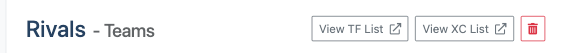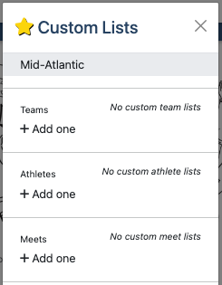From the team Homepage, in the banner under the team name, find Custom Lists. There you will find the Custom Teams, Athletes, and Meets lists already created, or create your own by clicking Edit Custom Lists at the bottom.