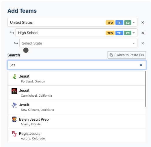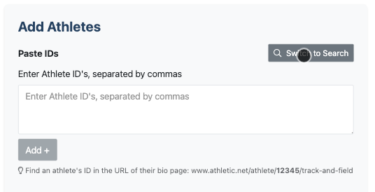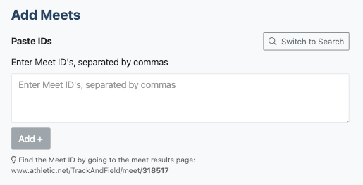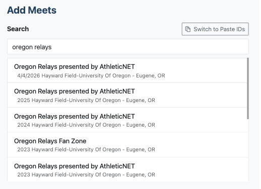 Once the list has been created, an Add Meets box will appear. Search for meets or paste meet IDs.
