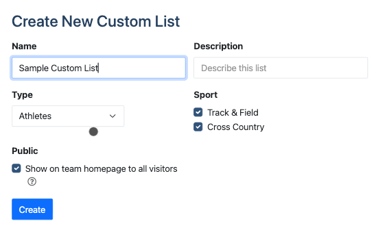 Want to see what a dream team of top athletes in your area would look like? Make a custom list. Fill in Name, Description, make sure Type is Athletes, uncheck the boxes for the Sports you DON'T want the list to show, uncheck the Public box if you only want your coaches to be able to view, and finally click Create. See this Sample Athlete List for an example.