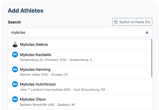 Once the Custom Athlete list is created, then you search for athletes or paste AthleteID's.