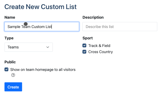 Open the Custom Lists Editor as shown above and fill in Name and Description. Make sure Type is Teams, and uncheck the boxes for the Sports you wish to exclude from the list. The checkbox under Public publishes the list on your team's homepage, while unchecking it will make the custom list visible only to your coaches. Finally, click Create.